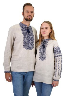 Чоловіча вишиванка виготовлена із натуральної лянної тканини, що є одним із показників високої якості. Зірка-алатир, яка закладена в основу візерунку - оберіг, один з найдавніших символів сонця.? Яскраво-синя вишивка чудово контрастує із тканиною, а котасики-зав'язки - вдало доповнюють образ.