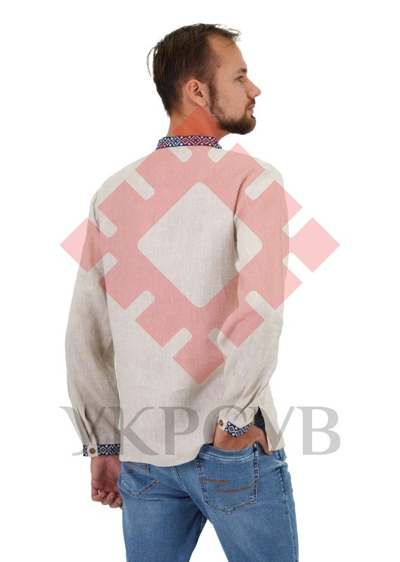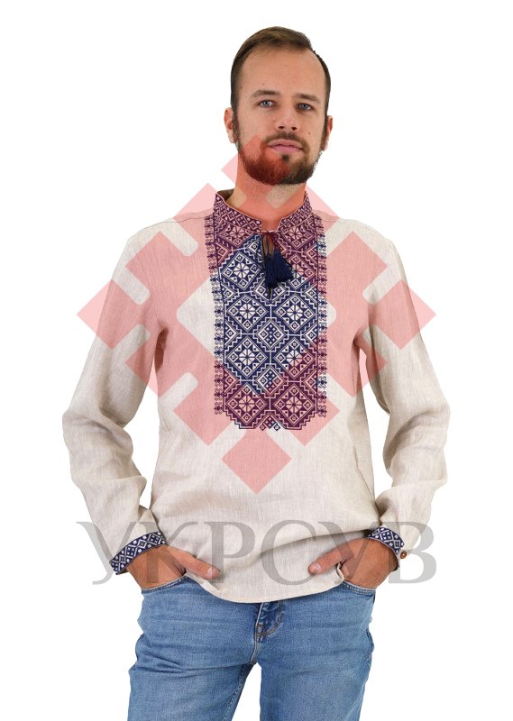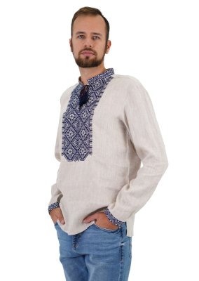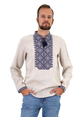 Чоловіча вишиванка виготовлена із натуральної лянної тканини, що є одним із показників високої якості. Зірка-алатир, яка закладена в основу візерунку - оберіг, один з найдавніших символів сонця.? Яскраво-синя вишивка чудово контрастує із тканиною, а котасики-зав'язки - вдало доповнюють образ.