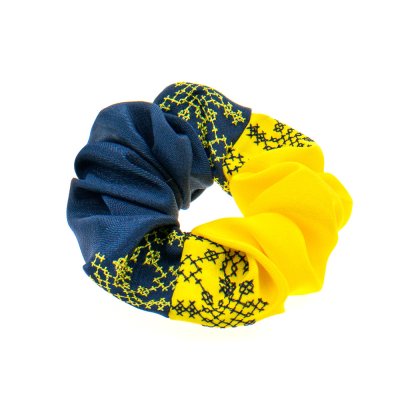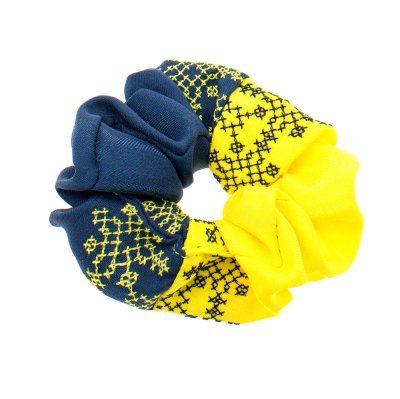 Вишита резинка для волосся №881. Матеріал – матовий сатин темно-синього та жовтого кольору. Вишивка хрестиком.