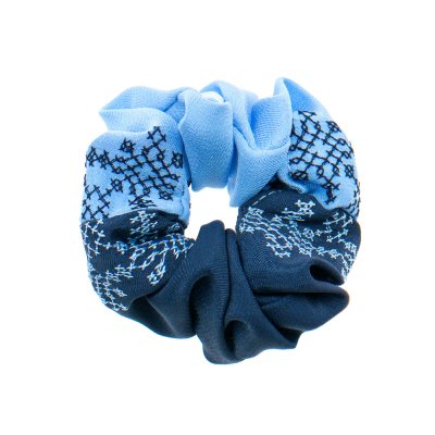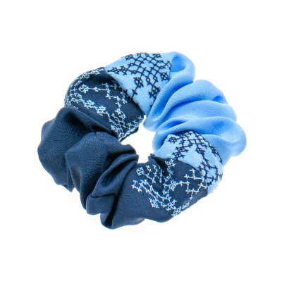 Вишита резинка для волосся №883. Матеріал – матовий сатин темно-синього та блакитного кольору. Вишивка хрестиком.
