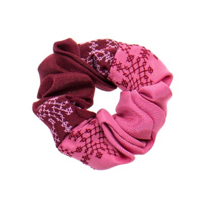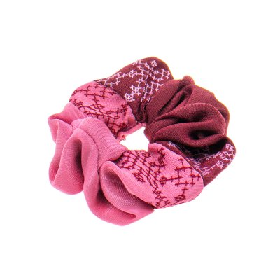 Вишита резинка для волосся №885. Матеріал – матовий сатин бордового та рожевого кольору. Вишивка хрестиком.