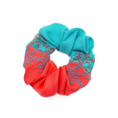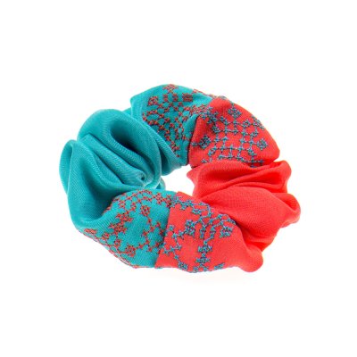 Вишита резинка для волосся №892. Матеріал – матовий сатин бірюзового та моркв'яного кольору. Вишивка хрестиком.
