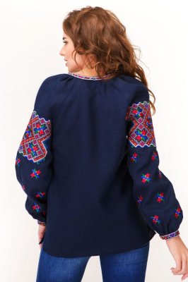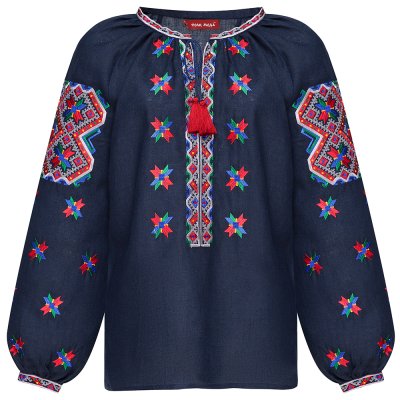 Жіноча вишиванка в синьому кольорі поєднала в собі давні традиції, сучасні тенденції та комфорт. Натуральна лляна тканина, акуратна машинна вишивка гляддю, дерев'яна фурнітура - визначає високу якість виробу. Візерунок, в основу якого покладений давній оберіг та символ - зірка-Алатир, розміщений спереду сорочки та на рукавах.