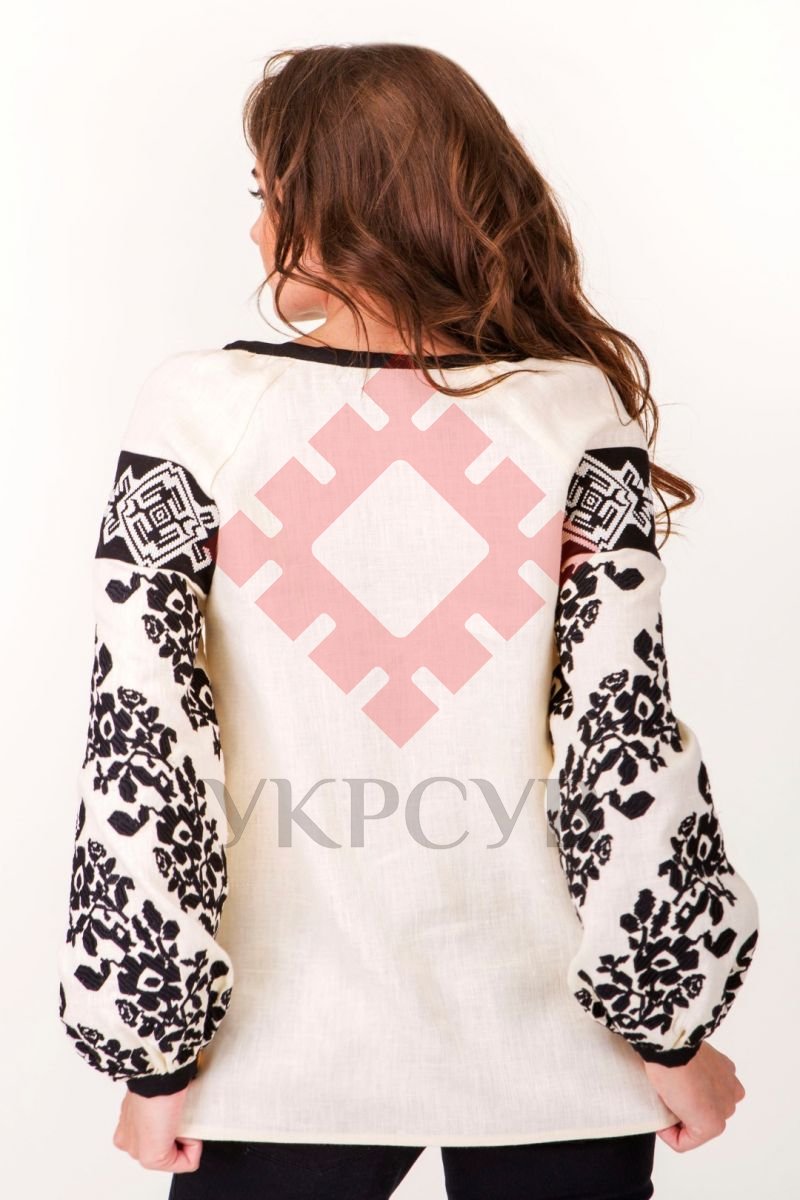 Ця вишукана жіноча вишиванка молочного кольору виконана за мотивами борщівської вишивки. Дана модель сорочки багата на різноманітні деталі: пишні та вишиті рукава, округла горловина, чорні лляні вставки на рукавах, а також незвична квіткова вишивка гладдю. Така вишиванка підкреслить Вашу красу та стане Вашим оберегом!