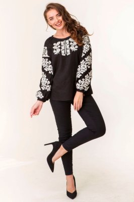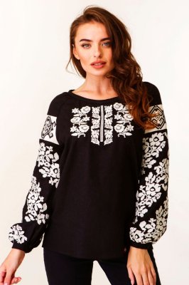 Ця вишукана жіноча вишиванка з чорного льону виконана за мотивами борщівської вишивки. Дана модель сорочки багата на різноманітні деталі: пишні та вишиті рукава, округла горловина, кремові лляні вставки на рукавах, а також незвична квіткова вишивка гладдю. Таку вишиванку повинна мати кожна українська жінка!