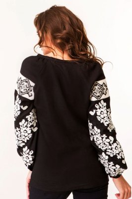 Ця вишукана жіноча вишиванка з чорного льону виконана за мотивами борщівської вишивки. Дана модель сорочки багата на різноманітні деталі: пишні та вишиті рукава, округла горловина, кремові лляні вставки на рукавах, а також незвична квіткова вишивка гладдю. Таку вишиванку повинна мати кожна українська жінка!