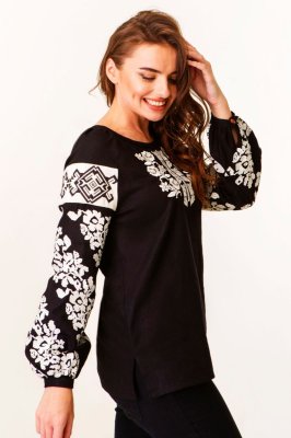 Ця вишукана жіноча вишиванка з чорного льону виконана за мотивами борщівської вишивки. Дана модель сорочки багата на різноманітні деталі: пишні та вишиті рукава, округла горловина, кремові лляні вставки на рукавах, а також незвична квіткова вишивка гладдю. Таку вишиванку повинна мати кожна українська жінка!