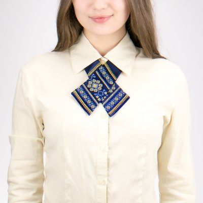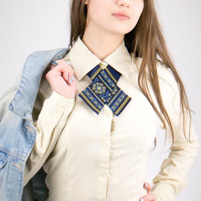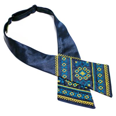 Крос-краватка або краватка-бант Мавка виготовлена з сатину, оздоблений стилізованою українською вишивкою. Декоративною особливістю виробу є стилізована вишивка, що розміщена по центру кроса (симетрично на обох деталях краватки). Краватка має застібку і регулятор, що дає змогу дуже швидкого і простого вдягання, тому аксесуар не потребує специфічних навичок зав'язування! Крос-краватка Мавка одинаково пасуватиме як під офісне вбрання на кожен день, так і на презентації або навіть вечірки.Категорія: Крос-краватки Загальна інформація