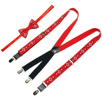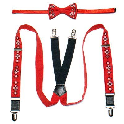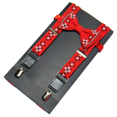 Вишитий набір складається з вишитих підтяжок та вишитого метелика. Матеріал виробів – костюмна тканина червоного кольору та вставки зі шкіри. Метелик має зручну застібку та регулятор довжини, що дуже спрощує життя своєму господарю, особливо в термінових ситуаціях. Довжина підтяжок регулюється за допомогою регуляторів та становить приблизно 120 см, ширина – 3 см. Металева фурнітура гарної якості та має надійну фіксацію. Вишитий набір запакований в фірмову упаковку ручної роботи, виготовлену з чорного дизайнерського картону.Категорія: Набор: підтяжки та метелик Загальна інформація