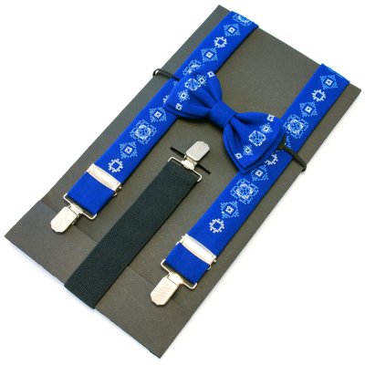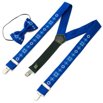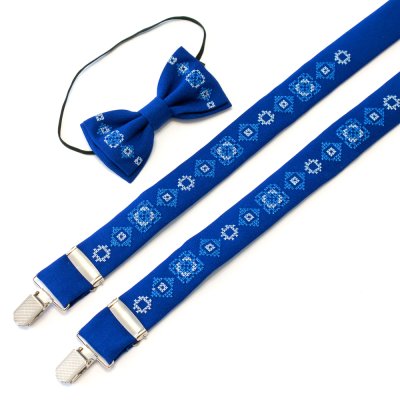 Дитячий вишитий набір складається з дитячих вишитих підтяжок і вишитого метелика. Матеріал виробів - костюмна тканина синього електрик кольору. Довжина підтяжок регулюється за допомогою металевих регуляторів та становить приблизно 77 см, ширина 3 см. Кріплення метелика здійснюється на резинці для швидкого одягання на вашого непосидючого. Комплект запакований в фірмову упаковку ручної роботи з дизайнерського картону.Категорія: Дитячий набор: підтяжки та метелик Загальна інформація