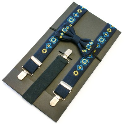 Дитячий вишитий набір складається з дитячих вишитих підтяжок і вишитого метелика. Матеріал виробів - костюмна тканина синього кольору. Довжина підтяжок регулюється за допомогою металевих регуляторів та становить приблизно 77 см, ширина 3 см. Кріплення метелика здійснюється на резинці для швидкого одягання на вашого непосидючого. Комплект запакований в фірмову упаковку ручної роботи з дизайнерського картону.Категорія: Дитячий набор: підтяжки та метелик Загальна інформація