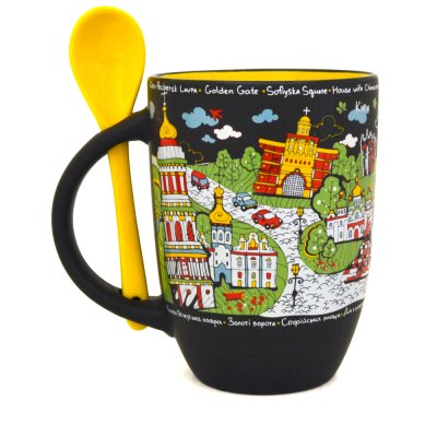Чашка Київ - креатив, з ложкою, жовта, 330 мл