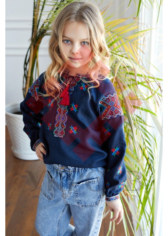 Дитяча вишиванка в синьому кольорі поєднала в собі давні традиції, сучасні тенденції та комфорт. Натуральна лляна тканина, акуратна машинна вишивка гляддю, дерев'яна фурнітура - визначає високу якість виробу від "Фолк Мода". Візерунок, в основу якого покладений давній оберіг та символ - зірка-Алатир, розміщений спереду сорочки та на рукавах.