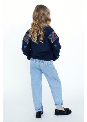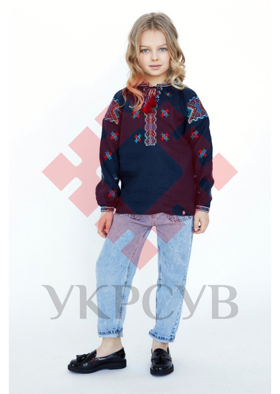 Дитяча вишиванка в синьому кольорі поєднала в собі давні традиції, сучасні тенденції та комфорт. Натуральна лляна тканина, акуратна машинна вишивка гляддю, дерев'яна фурнітура - визначає високу якість виробу від "Фолк Мода". Візерунок, в основу якого покладений давній оберіг та символ - зірка-Алатир, розміщений спереду сорочки та на рукавах.