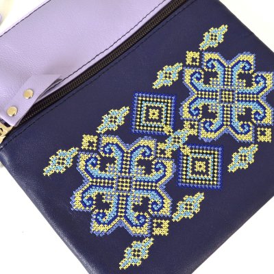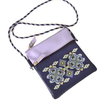 - Вишита сумка на плече виготовлена з натуральної шкіри. Декоративною родзинкою сумки є геометричний орнамент в українському стилі, вишитий хрестиком. Пасок на плече виготовлений методом плетіння. Довжина паска - 118 см. Сумка – прямокутної форми розміром 19,5 х 21 см. Застібка – на блискавку. Ззовні сумки, окрім основного відділення, є велика кишеня для телефону, гаманця, ключів та інших корисних дрібниць.