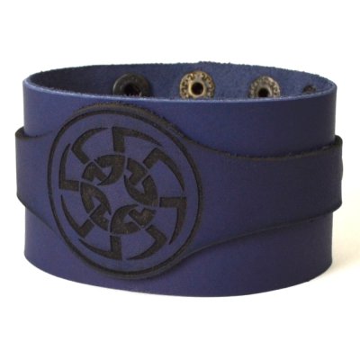 Браслет виконаний з натуральної шкіри, прикрашений символом Сонцеворот, який виконаний технікою тиснення.