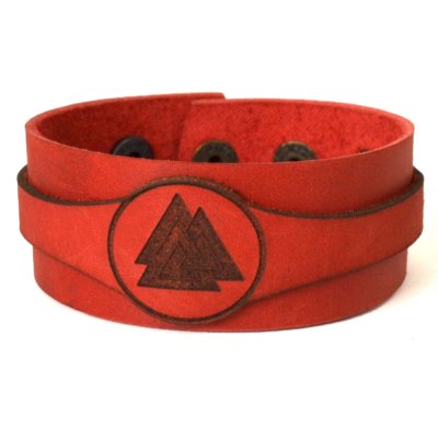 Браслет виконаний з натуральної шкіри, прикрашений символом Валькнут, який виконаний технікою тиснення.
