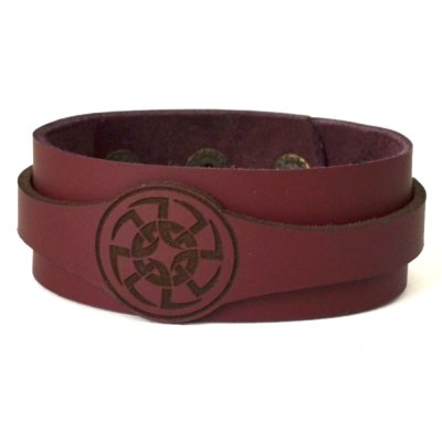 Браслет виконаний з натуральної шкіри, прикрашений символом Сонцеворот, який виконаний технікою тиснення.