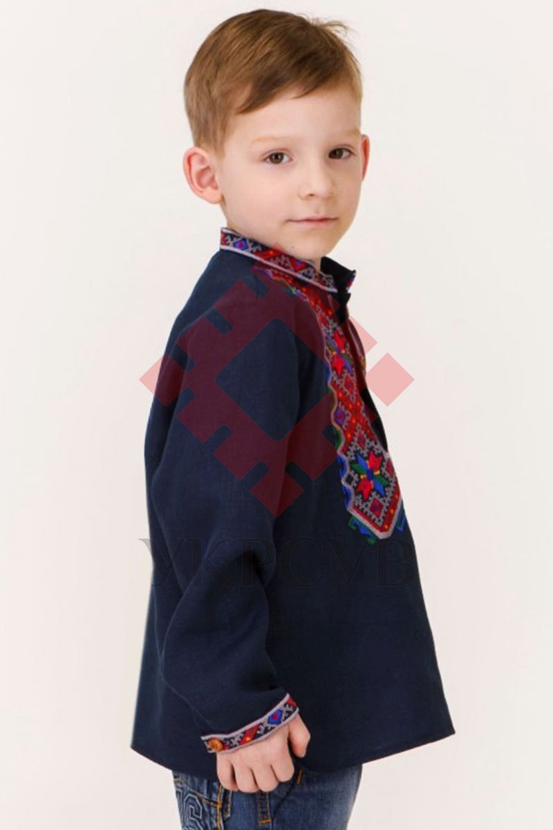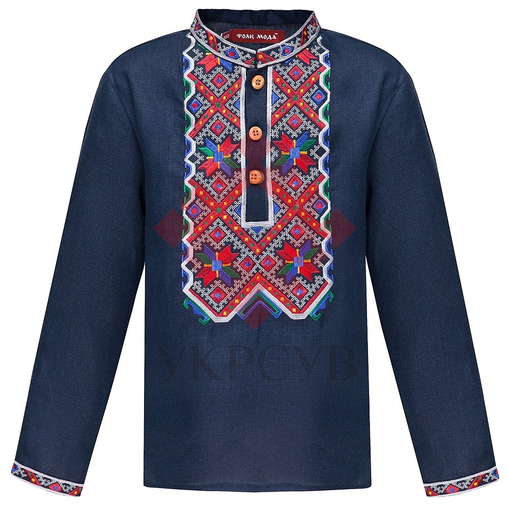 Дитяча вишиванка в синьому кольорі поєднала в собі давні традиції, сучасні тенденції та комфорт. Натуральна лляна тканина, акуратна машинна вишивка гляддю, дерев'яна фурнітура - визначає високу якість виробу від "Фолк Мода". Візерунок, в основу якого покладений давній оберіг та символ - зірка-Алатир, розміщений спереду сорочки та на рукавах.