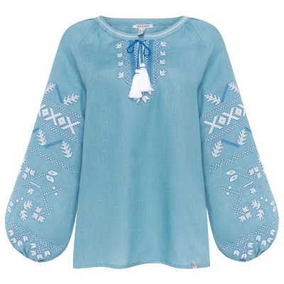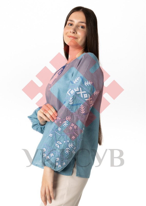 Вишиванка виготовлена з натурального 100% льону ніжного блакитного кольору. Традиційна вишивка хрестиком прикрашає вишиванку спереду та на рукавах.