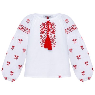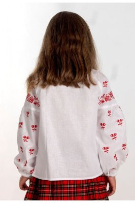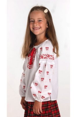 Ця дитяча вишита сорочка личитиме дівчинці будь-якого віку. Білосніжна вишиванка є влучним варіантом для шкільних заходів та святкових днів. Вільний крій виробу не обмежує рухи. Виготовлена з натуральної тканини "міткаль", яка дає шкірі можливість "дихати" і добре вбирає вологу. Вишивка виконана хрестиком червоними нитками. Візерунки розміщені на грудях і рукавах виробу.Загальна інформація