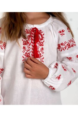 Ця дитяча вишита сорочка личитиме дівчинці будь-якого віку. Білосніжна вишиванка є влучним варіантом для шкільних заходів та святкових днів. Вільний крій виробу не обмежує рухи. Виготовлена з натуральної тканини "міткаль", яка дає шкірі можливість "дихати" і добре вбирає вологу. Вишивка виконана хрестиком червоними нитками. Візерунки розміщені на грудях і рукавах виробу.Загальна інформація