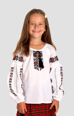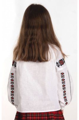 Ця дитяча вишита сорочка личитиме дівчинці будь-якого віку. Білосніжна вишиванка є влучним варіантом для шкільних заходів та святкових днів. Вільний крій виробу не обмежує рухи. Виготовлена з натуральної тканини "міткаль", яка дає шкірі можливість "дихати" і добре вбирає вологу. Вишивка виконана хрестиком червоними та чорними нитками. Візерунки розміщені на грудях і рукавах виробу.Загальна інформація