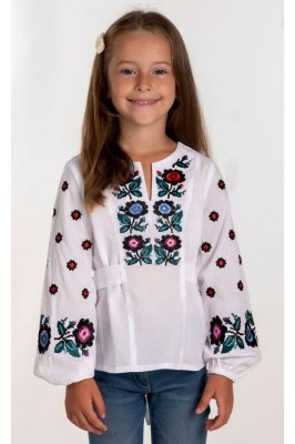 Ця дитяча вишита сорочка личитиме дівчинці будь-якого віку. Білосніжна вишиванка є влучним варіантом для шкільних заходів та святкових днів. Вільний крій виробу не обмежує рухи. Виготовлена з натуральної тканини "батист", яка дає шкірі можливість "дихати" і добре вбирає вологу. Вишивка виконана гладдю різнобарвними нитками. Візерунки розміщені на грудях і рукавах виробу.Загальна інформація