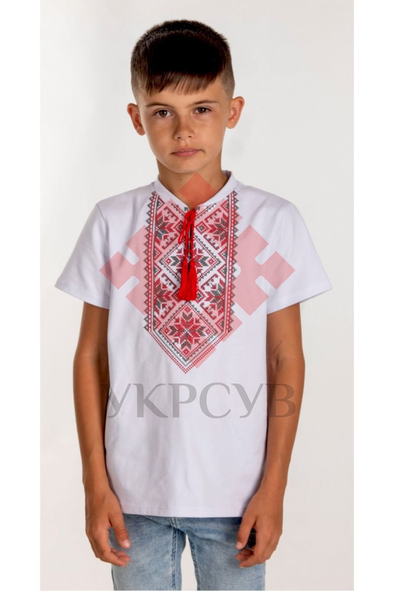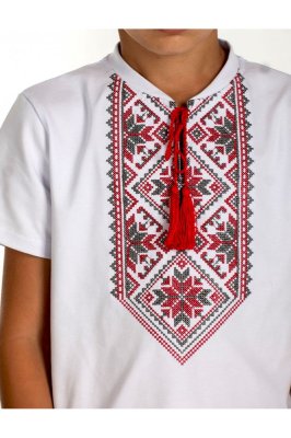 Дитяча футболка білого кольору з українською вишивкою личитиме кожній дитині. Зручний крій, якісні, безпечні матеріали, акуратна вишивка Вас приємно здивує. Український орнамент виконаний хрестиком червоними та чорними нитками.Загальна інформація