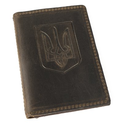 Обкладинка виконана з натуральної шкіри з тисненням Гербу України - Тризуб.