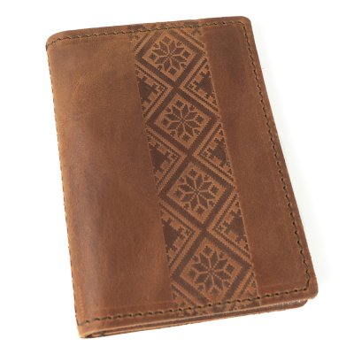 Обкладинка виконана з натуральної шкіри з тисненням традиційного візерунку.
