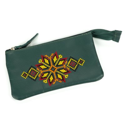 - Вишита косметичка виготовлена з натуральної шкіри. Передня частина декорована вишивкою хрестиком.
