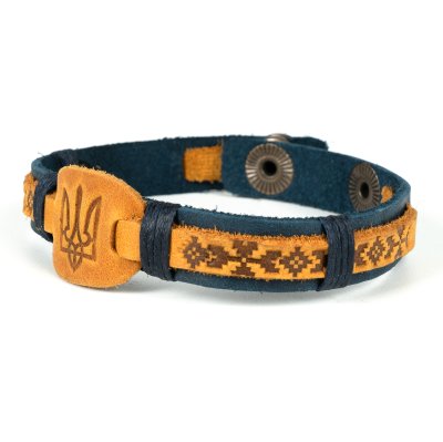 Браслет виконаний з натуральної шкіри, прикрашений Тризубом та візерунками, що виконані технікою тиснення.