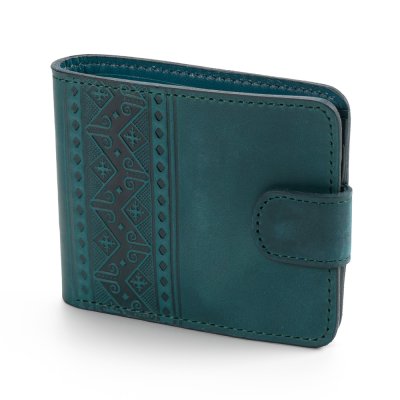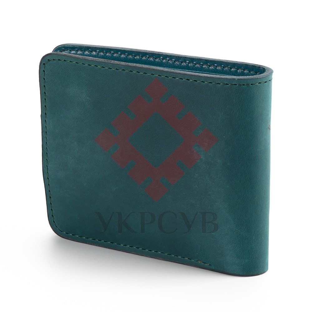 Гаманець виконаний з натуральної шкіри, з тисненням візерунку. Гаманець має два відділи для купюр, один відділ для монет, один - для фото та 5 відділів для карток.
