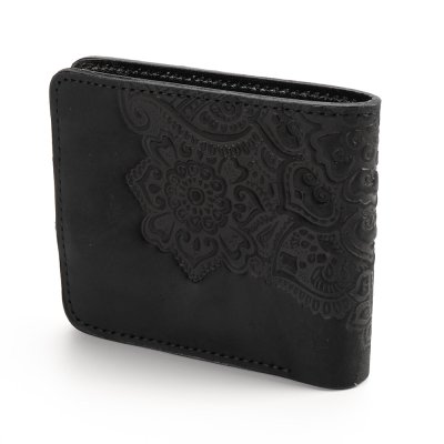 Гаманець виконаний з натуральної шкіри, з тисненням візерунку. Гаманець має два відділи для купюр, один відділ для монет, один - для фото та 5 відділів для карток.