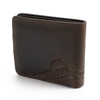 Гаманець виконаний з натуральної шкіри, з тисненням візерунку. Гаманець має два відділи для купюр, один відділ для монет, один - для фото та 5 відділів для карток.