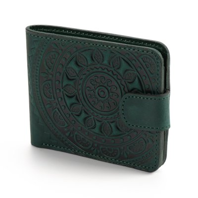 Гаманець виконаний з натуральної шкіри, з тисненням візерунку. Гаманець має два відділи для купюр, один відділ для монет, один - для фото та 5 відділів для карток.
