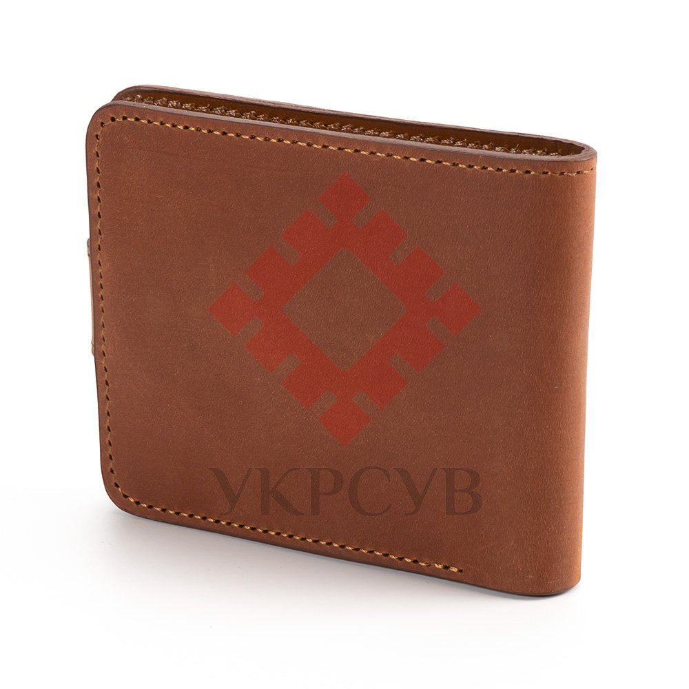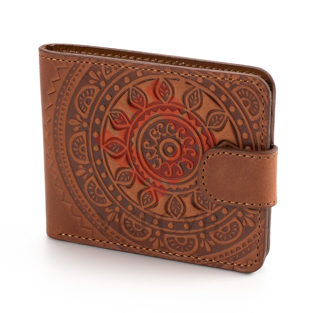 Гаманець виконаний з натуральної шкіри, з тисненням візерунку. Гаманець має два відділи для купюр, один відділ для монет, один - для фото та 5 відділів для карток.