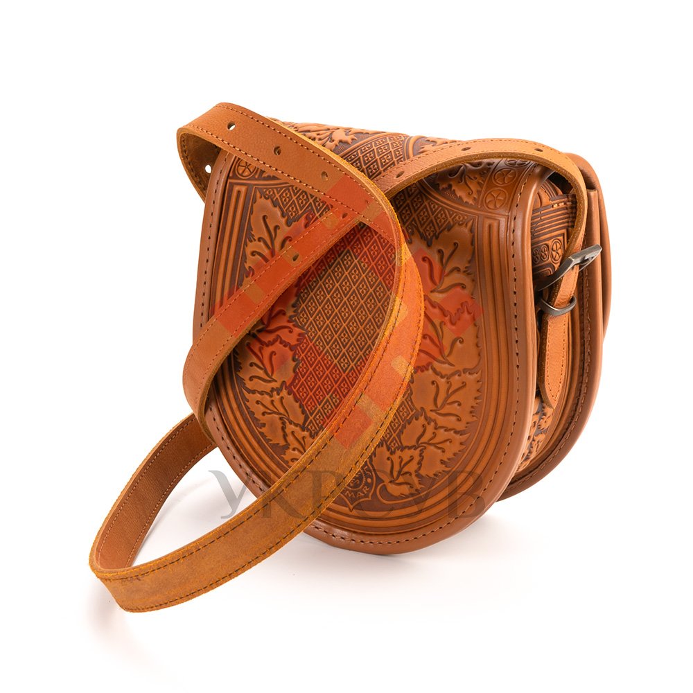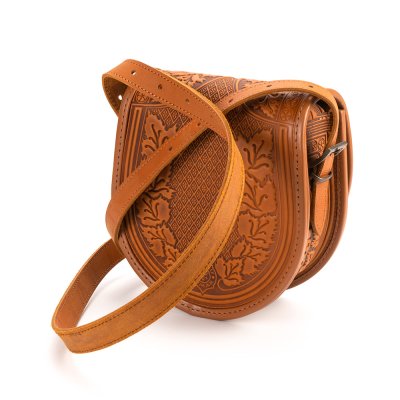 - Сумка "Калина" виготовлена з якісної, щільної натуральної шкіри. Декоративною родзинкою сумки є оригінальний орнамент в українському стилі, зроблений методом гарячого тиснення. Наплічний ремінь регулюється по довжині. Ширина - 25 мм. Сумка має оригінальну форму та оснащена двома кишенями: на передній стінці під клапаном (застібається кнопкою) та всередині. Розмір: 21х20х9 см.