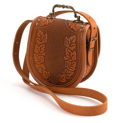 - Сумка "Калина", з металевою ручкою, виготовлена з якісної, щільної натуральної шкіри. Декоративною родзинкою сумки є оригінальний орнамент в українському стилі, зроблений методом гарячого тиснення. Наплічний ремінь регулюється по довжині. Ширина - 25 мм. Сумка має оригінальну форму та оснащена двома кишенями: на передній стінці під клапаном (застібається кнопкою) та всередині. Розмір: 21х20х9 см.