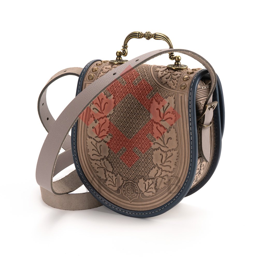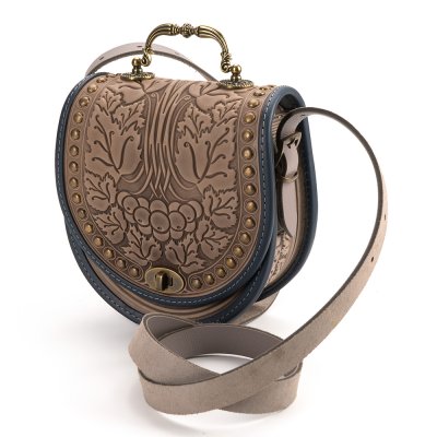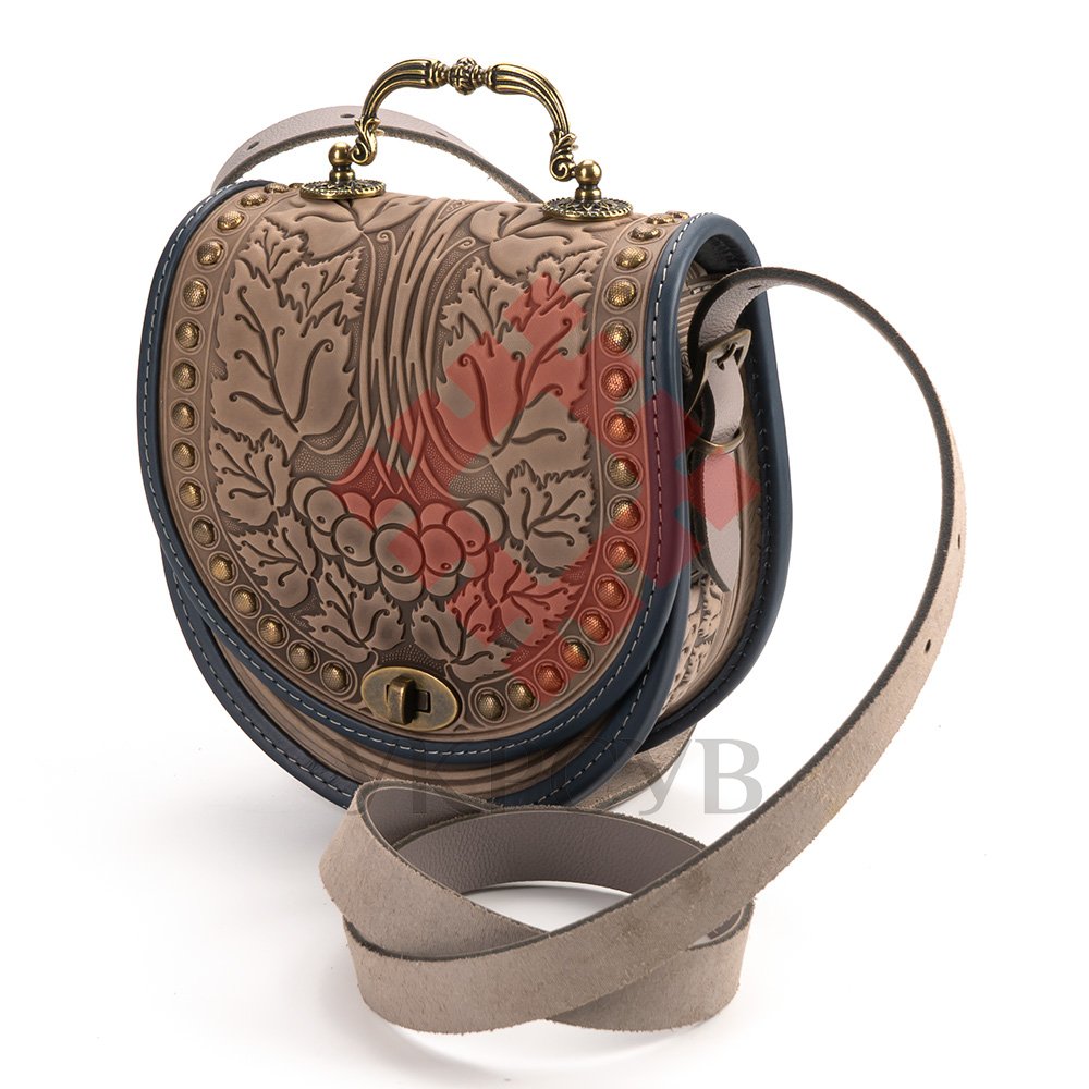 - Сумка "Калина", з металевою ручкою, виготовлена з якісної, щільної натуральної шкіри. Декоративною родзинкою сумки є оригінальний орнамент в українському стилі, зроблений методом гарячого тиснення. Наплічний ремінь регулюється по довжині. Ширина - 25 мм. Сумка має оригінальну форму та оснащена двома кишенями: на передній стінці під клапаном (застібається кнопкою) та всередині. Розмір: 21х20х9 см.