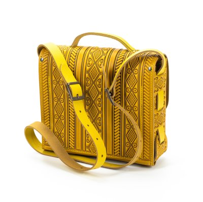 - Портфель шкіряний "Проект", виготовлений з якісної, щільної натуральної шкіри. Декоративною родзинкою сумки є оригінальний орнамент в українському стилі, зроблений методом гарячого тиснення. Наплічний ремінь регулюється по довжині. Ширина - 25 мм. Портфель оснащений двома кишенями: на передній стінці під клапаном (застібається кнопкою) та всередині. Розмір: 25х21х8 см.