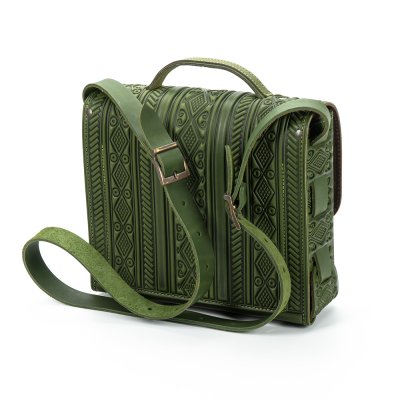 - Портфель шкіряний "Проект", виготовлений з якісної, щільної натуральної шкіри. Декоративною родзинкою сумки є оригінальний орнамент в українському стилі, зроблений методом гарячого тиснення. Наплічний ремінь регулюється по довжині. Ширина - 25 мм. Портфель оснащений двома кишенями: на передній стінці під клапаном (застібається кнопкою) та всередині. Розмір: 25х21х8 см.