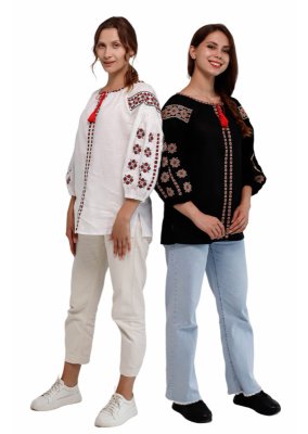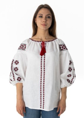 Вишиванка виготовлена з натурального 100% льону та прикрашена делікатною традиційною вишивкою хрестиком у чорно-червоних тонах.