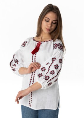 Вишиванка виготовлена з натурального 100% льону та прикрашена делікатною традиційною вишивкою хрестиком у чорно-червоних тонах.