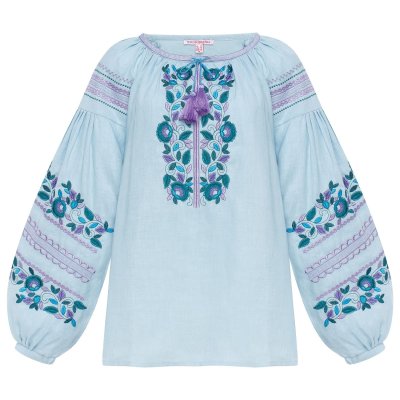 Ця вишиванка небесно-блакитного кольору вигідно підкреслить яскравість Вашої натури. Дана модель цільного крою, прямого силуету, з довгим рукавом, горловина оздоблена обшивкою і регулюється за допомогою крученого шнура з китицями. Вишивка виконана гладдю бузково-смарагдовими нитками та прикрашає рукави і перед сорочки. В основі орнаменту квіткові та геометричні елементи.