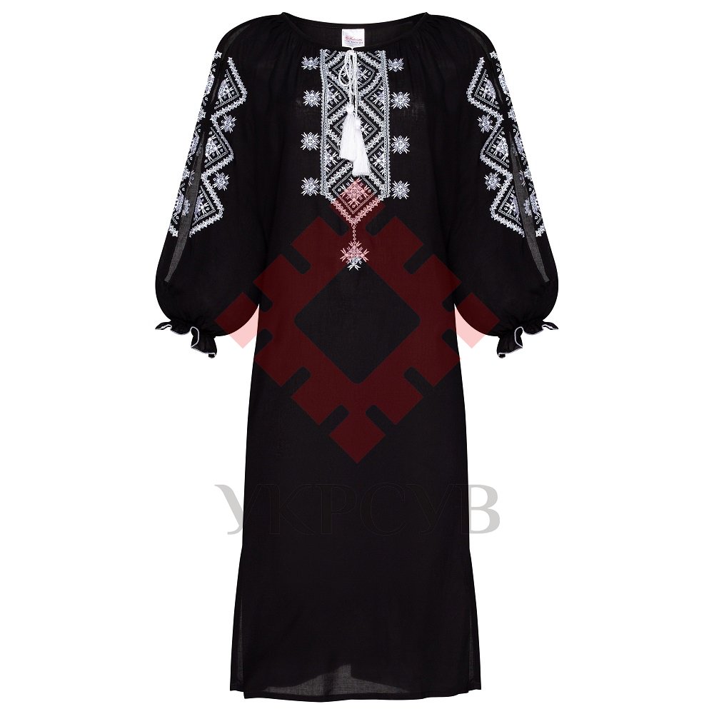 Кольори вишивки – білий, сірий. Контрастна вишивка, легка тканина, вільний крій, розрізи на рукавах та на спідниці - те, що робить цю сукню втіленням елегантності, жіночності та легкості.