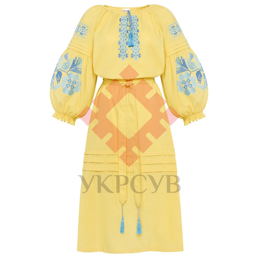 Сукня виготовлена з натурального льону жовтого кольору. Стильна сукня з одноколірним геометричним візерунком. Вишивка виконана в техніці «гладь».