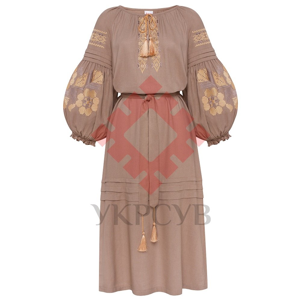 Сукня виготовлена з натурального льону коричневого кольору. Стильна сукня з одноколірним геометричним візерунком. Вишивка виконана в техніці «гладь».