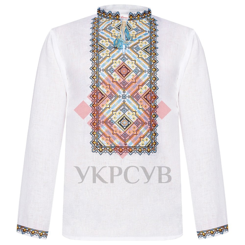 Вишиванка білого кольору. Нестандартні колірні рішення плюс комбінація технік: «гладь» і «хрест» – роблять цю модель дійсно оригінальною. Геометричний візерунок, в основу якого покладений давній оберіг та символ - ромб, розміщений спереду сорочки, на комірці та манжетах. Модель оснащена китицями.